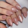 “Aurora Veil” features a long almond press-on shape with a blush ombré base, gold foil accents, and a clear-gloss overlay. This design evokes the perfect balance of soft femininity and high-end statement.