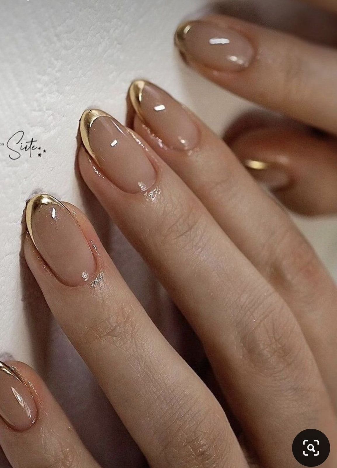 • Golden French tip with a couture vibe